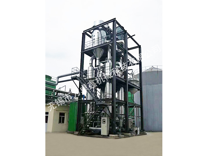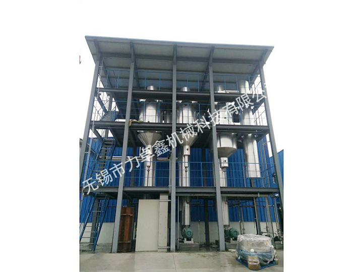 工作原理:四效降膜蒸發(fā)器需濃縮的料液由泵送入加熱管頂部,沿著加熱管內(nèi)壁形成液膜向下流動(dòng)。在這個(gè)過(guò)程中,由于管外的加熱,管內(nèi)液膜開(kāi)始沸騰并部分蒸發(fā)